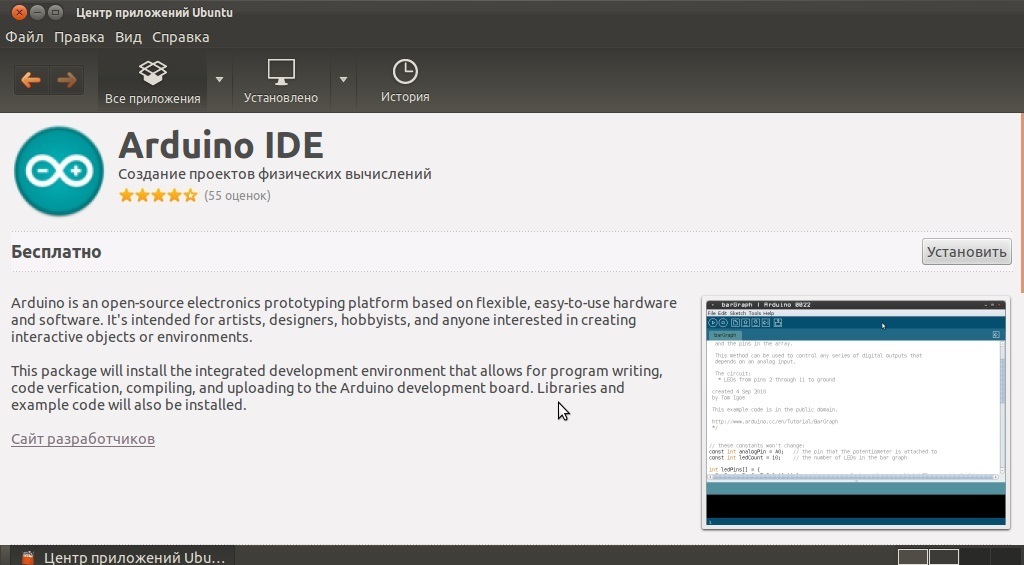 Рассмотрим установку Arduino IDE в операционной системе Linux. В Linux Ubuntu среда Arduino IDE устанавливается просто — она находится в репозитарии стандартных приложений Linux. Выбираем Arduino IDE из списка доступных программ в меню Ubuntu Приложения | Центр приложений Ubuntu | Загрузить приложение. В списке разделов выбираем Инструменты разработчика, в списке следующего уровня — Все приложения и в следующем открывшемся списке — Arduino IDE (рис. 3.3). Щелкаем левой кнопкой мыши на значке этой программы, справа от нее появляется кнопка Установить, нажимаем на эту кнопку, и среда устанавливается автоматически. Для запуска Arduino IDE выбираем пункт Приложения | Программирование | Arduino IDE.