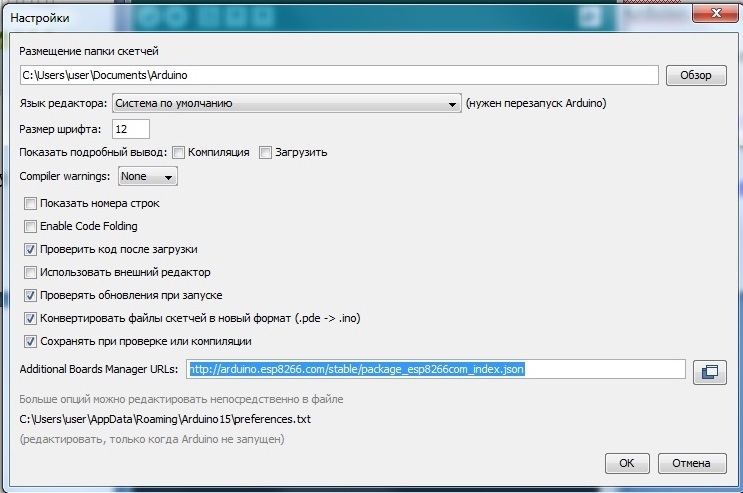 Сначала необходимо установить Arduino IDE с официального сайта версии не ниже 1.6.5. Запускаем Arduino IDE. Выбираем пункт Файл - Настройки и в поле Additional Boards Manager URLs вводим http://arduino.esp8266.com/stable/package_esp8266com_index.json. Нажимаем OK (см. рис. 3.7).