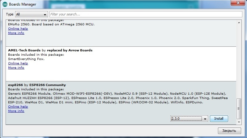 Выбираем пункт Инструменты - Плата - BoardsManager и в списке ищем плату ESP8266. Выбираем этот пункт, версию и нажимаем на Install (см. рис. 3.8, 3.9, 3.10).