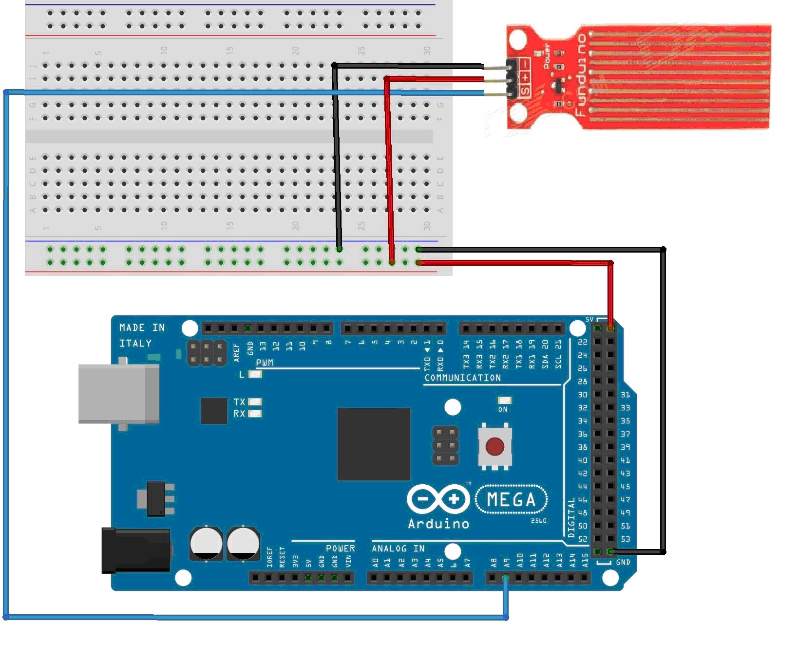 Рис. 4.20. Схема подключений датчика уровня воды к плате Arduino Mega
