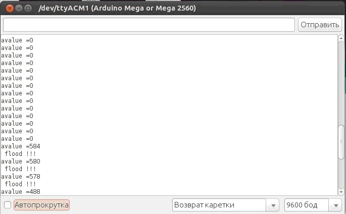 Загрузим скетч на плату Arduino Mega, откроем монитор последовательного порта и видим вывод данных, получаемых с датчика уровня воды (рис. 4.21). При попадание воды на датчик выводим пообщение о протекании. Подберите практическим путем аналоговое значения для константы LEVELWATER (пороговое значение погружения).