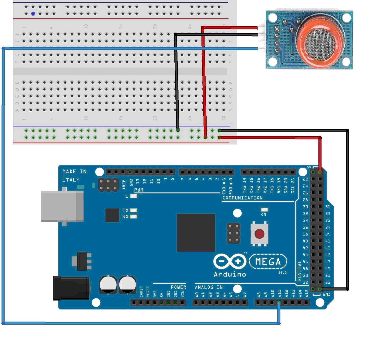 Рис. 4.30. Схема подключений датчика MQ-7 к плате Arduino Mega