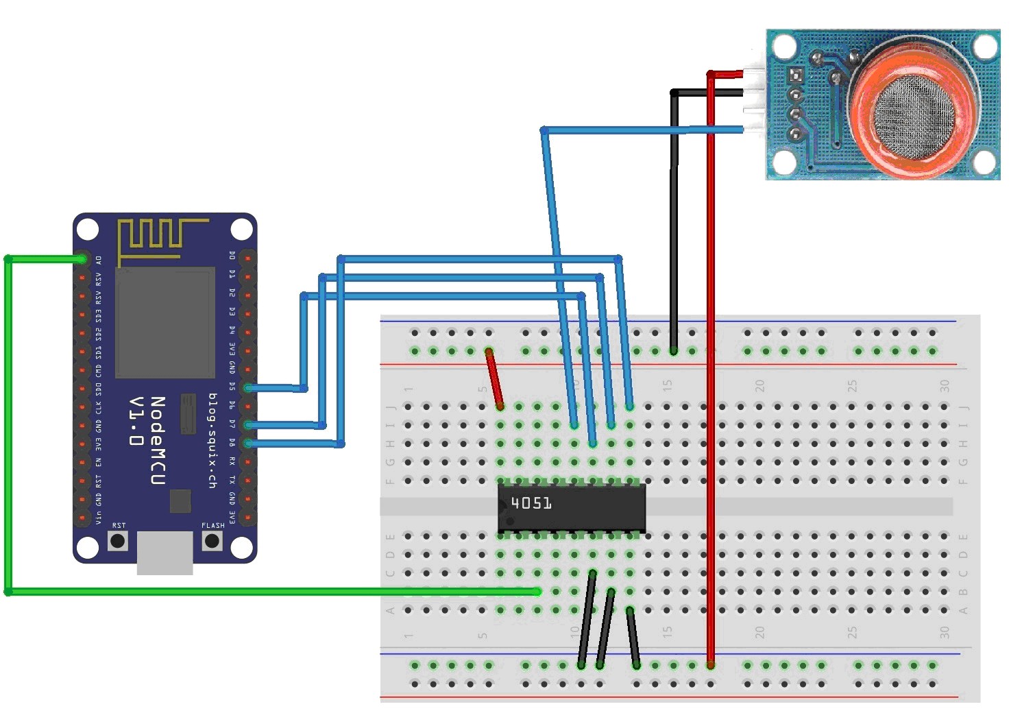 Теперь рассмотрим подключение датчика MQ-7 к модулю NodeMcu ESP8266. Датчик MQ-7 подключаем к входу y3 мультиплексора. Для выбора аналогового входа мультиплексора используем контакты D5, D7, D8 модуля Node Mcu. Схема соединений представлена на рис. 4.32.