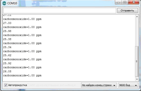 Загрузим скетч на плату Arduino Mega, откроем монитор последовательного порта и увидите вывод данных о содержании угарного газа CO.