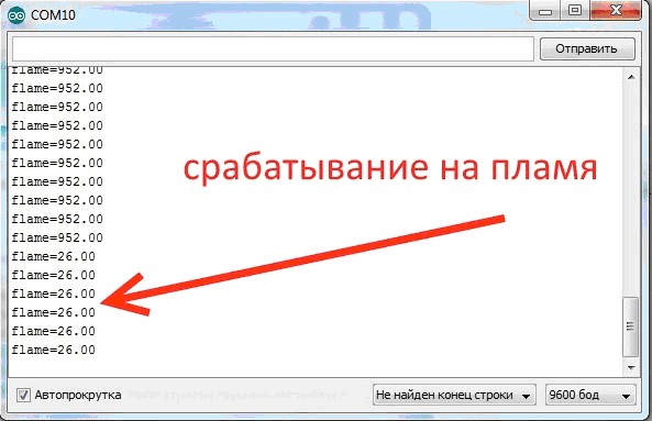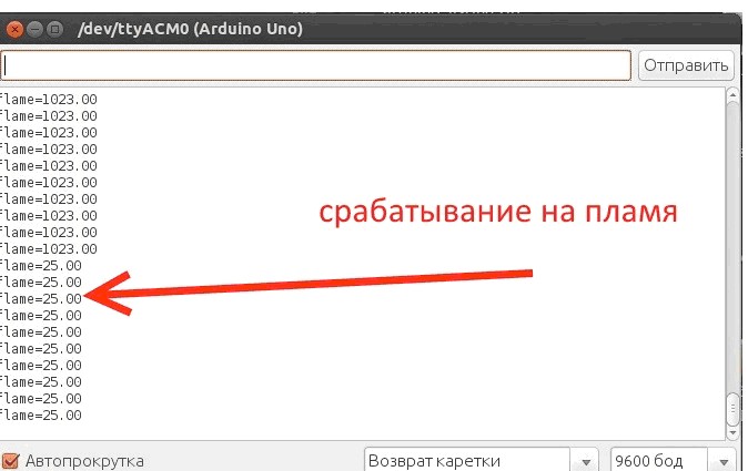 Загрузим на плату Arduino Mega скетч получения данных с модуля датчика Flame Sensor и вывода в последовательный порт Arduino. Процедура определения по данным, приходящим с аналогового входа get_data_flame().