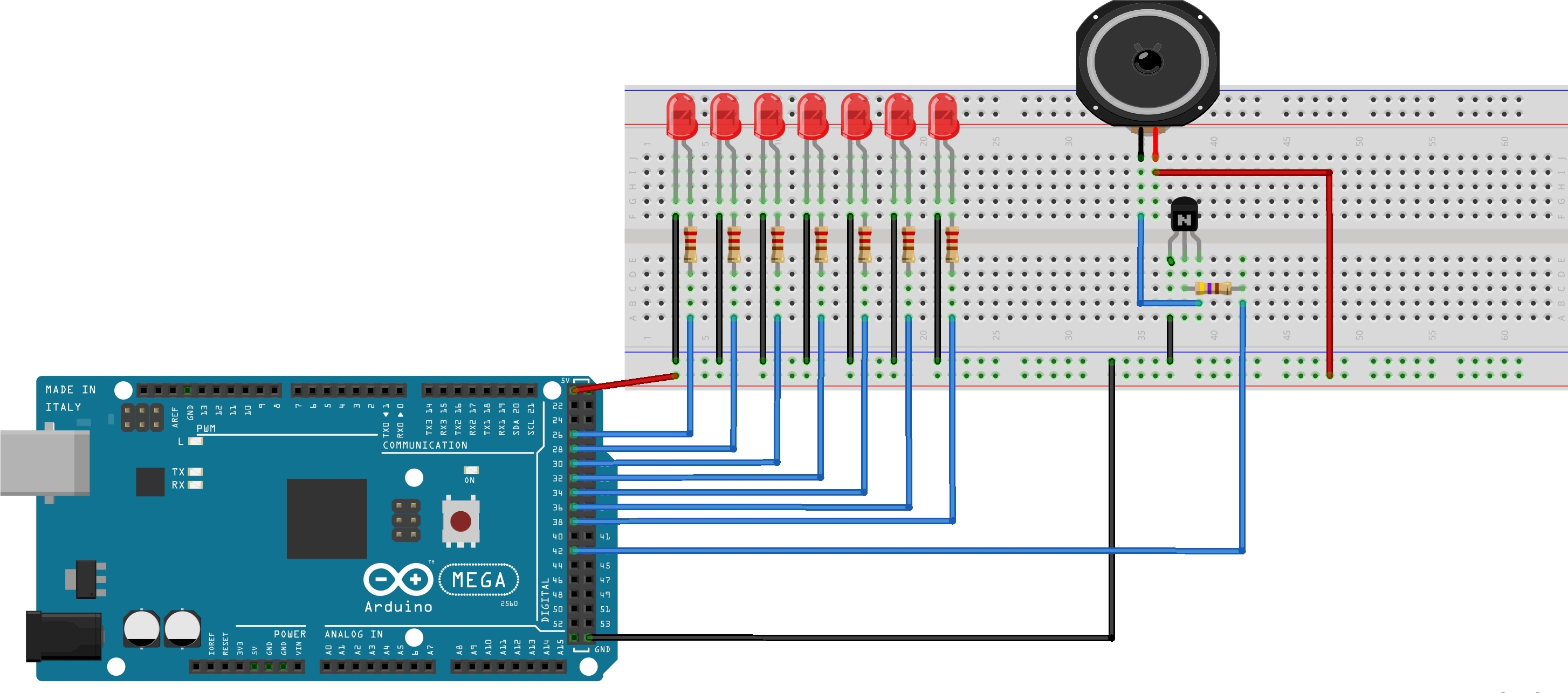 Рис. 5.6. Схема подключения светодиодов и динамика к плате Arduino Mega