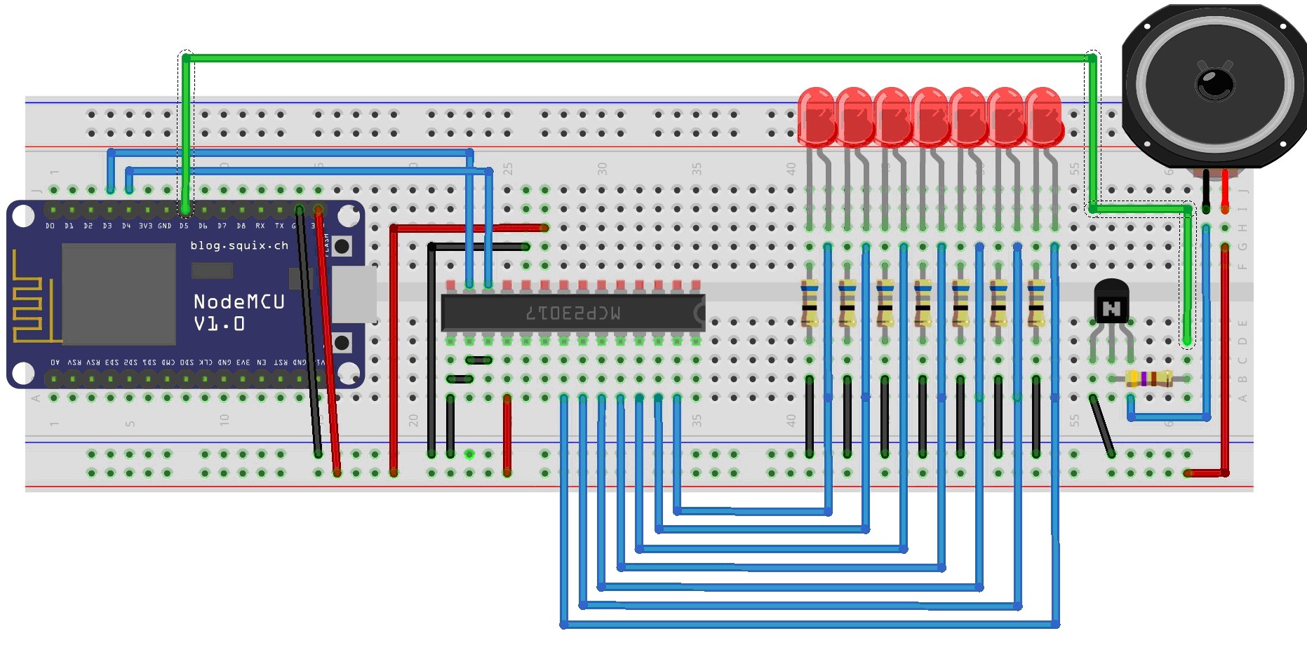 Для светодиодной индикации будем использовать обычные светодиоды, которые подсоединим к микросхеме расширителя входов MCP23017 (банку A выводы GPA0- GPA7). При подключении светодиодов используем ограничительные резисторы номиналом 150 Ом. Для звуковой индикации будем использовать небольшой динамик (рис. 5.5). При подключении динамика к выводу NodeMcu используем npn-транзистор и резистор номиналом 510 Ом. Схема соединений для подключения светодиодов и динамика к модулю NodeMcu показана на рис. 5.9.
