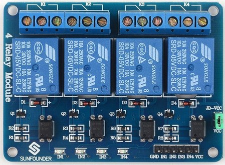 Для управления электроприборами пользуются различными клавишными выключателями и тумблерами. Чтобы управлять такими электроприборами с помощью микроконтроллера существует специальный тип выключателей - электромеханические реле. В состав набора ИНТЕРНЕТ ВЕЩЕЙ ДЛЯ УМНОГО ДОМА входит Relay Shield (см. рис. 6.1), который содержит четыре реле с необходимой обвязкой и позволяет контроллерам управлять четырьмя электроприборами.