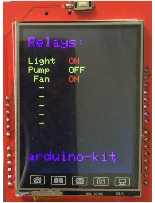В главе 5.2 мы рассматривали вывод данных, получаемых с датчиков на экран TFT 2.4" Shield. Теперь наv необходимо на экран дисплея выводить и данные о состоянии исполнительных устройств, подключенных к реле. Для этого нам необходимо формировать другие экраны, а также главный экран. Как мы будем делать переходы между экранами? Будем использовать сенсорный экран TFT 2.4" Shield.