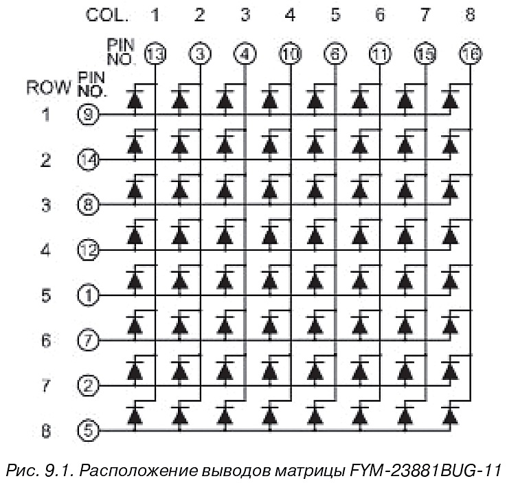 В светодиодных матрицах светодиоды расположены в определенном порядке, а выводы расположены в удобном для монтажа порядке. Светодиодные матрицы бывают одноцветными, двухцветными и RGB. В эксперименте будем использовать двухцветную светодиодную матрицу FYM-23881BUG-11, которая представляет собой набор из 64 светодиодов зеленого цвета, собранных в матрицу 8×8. Расположение выводов матрицы показано на рис. 9.1.