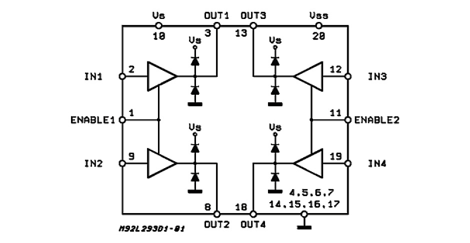 Шаговый двигатель – синхронный бесщёточный электродвигатель с несколькими обмотками, в котором ток, подаваемый в одну из обмоток статора, вызывает фиксацию ротора. Последовательная активация обмоток двигателя вызывает дискретные угловые перемещения (шаги) ротора. Напрямую, к выводам Arduino подключать ШД нельзя, для подключения используют либо драйверы шаговых двигателей (например, A4988), либо драйверы двигателей постоянного тока (ULN2003, L293). В эксперименте будем использовать микросхему L393, которая содержит в себе четыре мощных усилителя (см. рис. 19.1). Если на вход усилителя подается 1, то выход сажается на 12 В, если на вход подается 0, то вывод сажается на землю. Таким образом, подавая комбинации 0 и 1 на разные входы, можно сажать выводы двигателя на шины разной полярности, вращая движок в разные стороны.