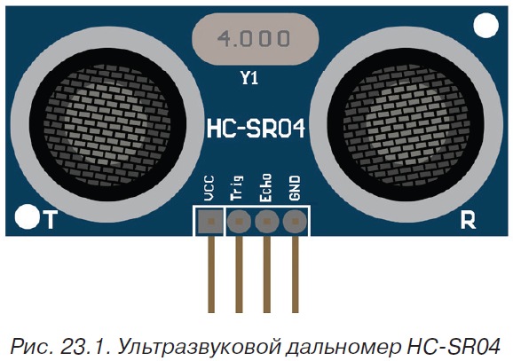 Ультразвуковой дальномер HC-SR04 (рис. 23.1) – это помещенные на одну плату приемник и передатчик ультразвукового сигнала. Излучатель генерирует сигнал, который, отразившись от препятствия, попадает на приемник. Измерив время, за которое сигнал проходит до объекта и обратно, можно оценить расстояние. Кроме самих приемника и передатчика, на плате находится еще и необходимая обвязка, чтобы сделать работу с этим датчиком простой и удобной.