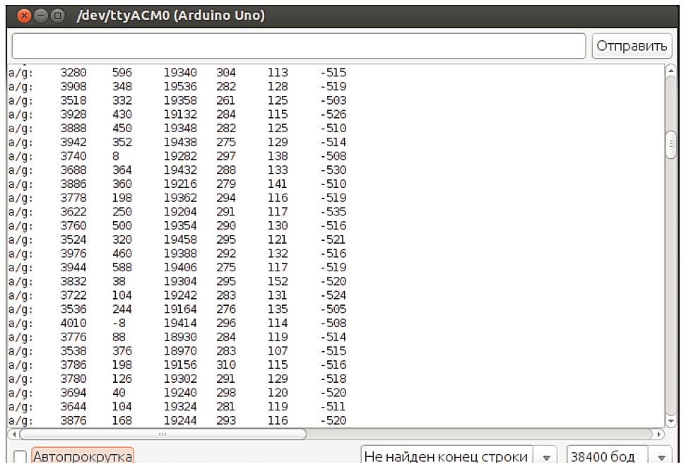 3. Открываем монитор последовательного порта Arduino IDE и смотрим вывод данных гироскопа и акселерометра (см. рис. 24.2).