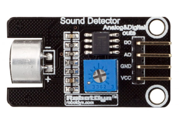 Детектор звука Модуль представляет собой микрофон. Данный модуль позволяет фиксировать и передавать в микроконтроллер звуки. На плате имеется переменный резистор, с помощью которого возможна настройка порога чувствительности цифрового выхода. Учитывая, что это устройство измеряет наличие или отсутствие звука, а так же порог чувствительности, вы можете сделать что-то, реагирующее на возникновение тишины или вы можете сделать что-то реагирующее на возникновение шума. Вы можете определить работает ли двигатель. При наличии или отсутствии звука, вы можете захотеть, включить музыку. При отсутствии звука, вы можете перейти в режим экономии энергии и выключить свет.