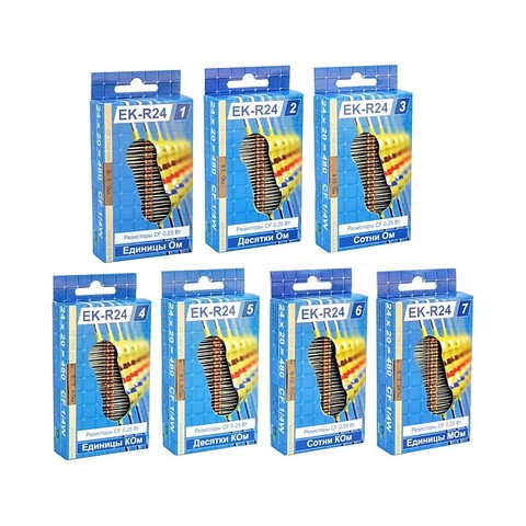 | Перечень номиналов резисторов | №1 | | №2 | | №3 | | №4 | | | 1 Ом | = 20шт | 10 Ом | = 20шт | 100 Ом | = 20шт | 1 KОм | = 20шт | | 1,1 Ом | = 20шт | 11 Ом | = 20шт | 110 Ом | = 20шт | 1,1 KОм | = 20шт | | 1,2 Ом | = 20шт | 12 Ом | = 20шт | 120 Ом | = 20шт | 1,2 KОм | = 20шт | | 1,3 Ом | = 20шт | 13 Ом | = 20шт | 130 Ом | = 20шт | 1,3 KОм | = 20шт | | 1,5 Ом | = 20шт | 15 Ом | = 20шт | 150 Ом | = 20шт | 1,5 KОм | = 20шт | | 1,6 Ом | = 20шт | 16 Ом | = 20шт | 160 Ом | = 20шт | 1,6 KОм | = 20шт | | 1,8 Ом | = 20шт | 18 Ом | = 20шт | 180 Ом | = 20шт | 1,8 KОм | = 20шт | | 2 Ом | = 20шт | 20 Ом | = 20шт | 200 Ом | = 20шт | 2 KОм | = 20шт | | 2,2 Ом | = 20шт | 22 Ом | = 20шт | 220 Ом | = 20шт | 2,2 KОм | = 20шт | | 2,4 Ом | = 20шт | 24 Ом | = 20шт | 240 Ом | = 20шт | 2,4 KОм | = 20шт | | 2,7 Ом | = 20шт | 27 Ом | = 20шт | 270 Ом | = 20шт | 2,7 KОм | = 20шт | | 3 Ом | = 20шт | 30 Ом | = 20шт | 300 Ом | = 20шт | 3 KОм | = 20шт | | 3,3 Ом | = 20шт | 33 Ом | = 20шт | 330 Ом | = 20шт | 3,3 KОм | = 20шт | | 3,6 Ом | = 20шт | 36 Ом | = 20шт | 360 Ом | = 20шт | 3,6 KОм | = 20шт | | 3,9 Ом | = 20шт | 39 Ом | = 20шт | 390 Ом | = 20шт | 3,9 KОм | = 20шт | | 4,3 Ом | = 20шт | 43 Ом | = 20шт | 430 Ом | = 20шт | 4,3 KОм | = 20шт | | 4,7 Ом | = 20шт | 47 Ом | = 20шт | 470 Ом | = 20шт | 4,7 KОм | = 20шт | | 5,1 Ом | = 20шт | 51 Ом | = 20шт | 510 Ом | = 20шт | 5,1 KОм | = 20шт | | 5,6 Ом | = 20шт | 56 Ом | = 20шт | 560 Ом | = 20шт | 5,6 KОм | = 20шт | | 6,2 Ом | = 20шт | 62 Ом | = 20шт | 620 Ом | = 20шт | 6,2 KОм | = 20шт | | 6,8 Ом | = 20шт | 68 Ом | = 20шт | 680 Ом | = 20шт | 6,8 KОм | = 20шт | | 7,5 Ом | = 20шт | 75 Ом | = 20шт | 750 Ом | = 20шт | 7,5 KОм | = 20шт | | 8,2 Ом | = 20шт | 82 Ом | = 20шт | 820 Ом | = 20шт | 8,2 KОм | = 20шт | | 9,1 Ом | = 20шт | 91 Ом | = 20шт | 910 Ом | = 20шт | 9,1 KОм | = 20шт | |